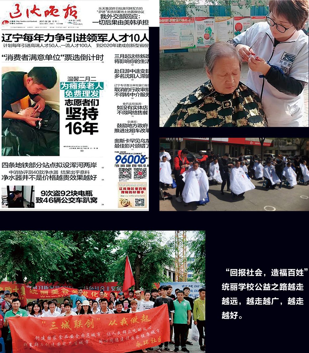 统丽学校建校十五年来一直热衷于公益事业,常年为养老院、社区、大学、幼儿园等机构提供免费理发、化妆、美甲等服务,得到社会各界的高度认可和好评。