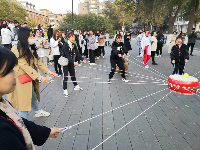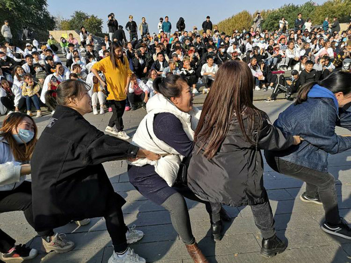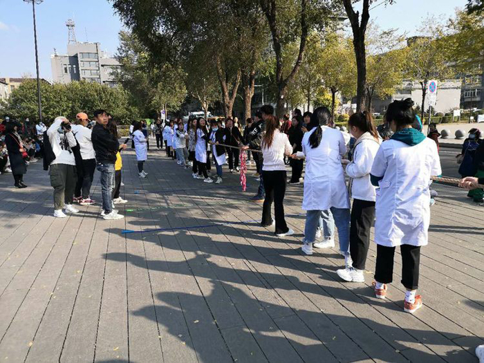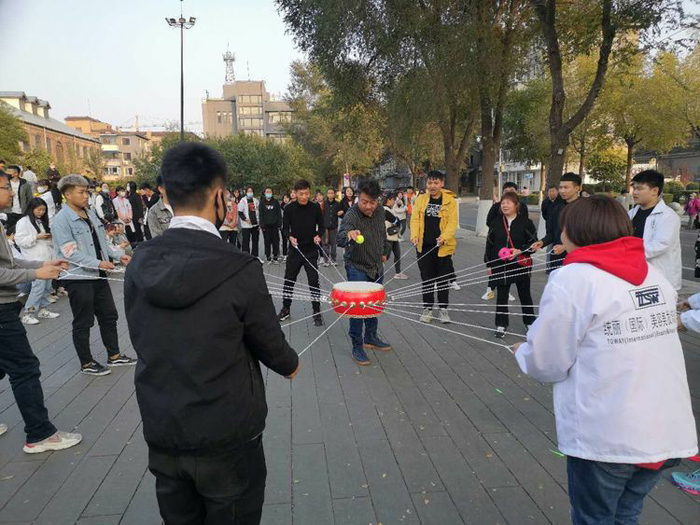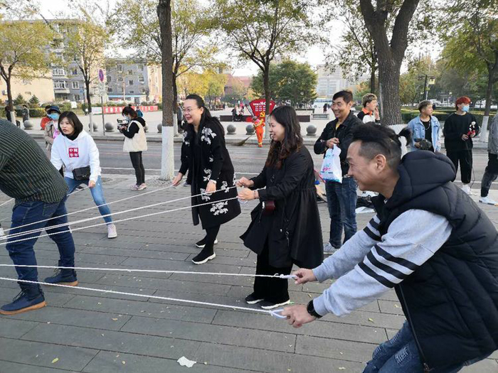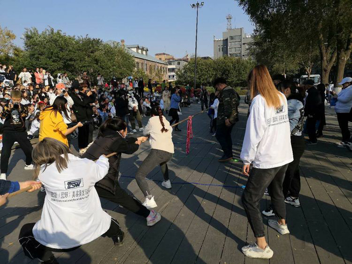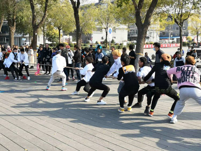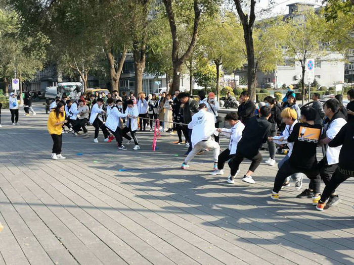 在穆鹏老师的宣布下,趣味运动会角逐开始。根据安排,此次运动会的比赛共有五个兼具竞技性、技巧性和趣味性的项目,对团队协作能力和个人身体素质都是比较强的考验。在如沸的助威呐喊和欢笑中,统丽学员以班级或专业为单位,先后进行了拔河、四人五足、转布条、呼啦圈接力和同心击鼓等比赛,无论场内参加比赛的,还是场外呐喊助威的,统丽师生无不神采飞扬、激情澎湃,周边驻足观看的男女老少,脸上也都洋溢着开心的笑容。